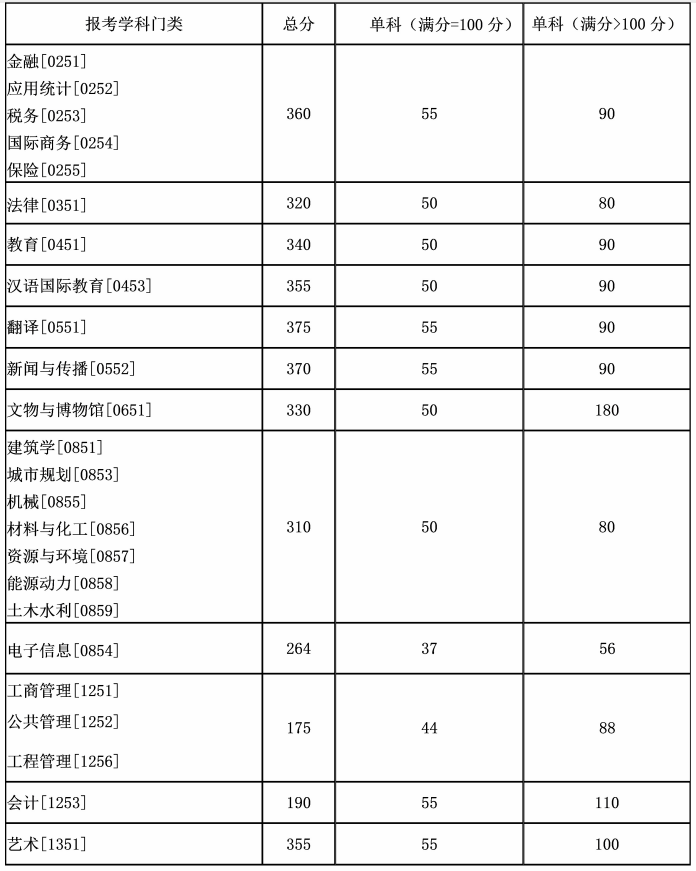 法律专业硕士初试成绩总分≥225 分;新闻与传播专业硕士初试成绩总分≥255 分。