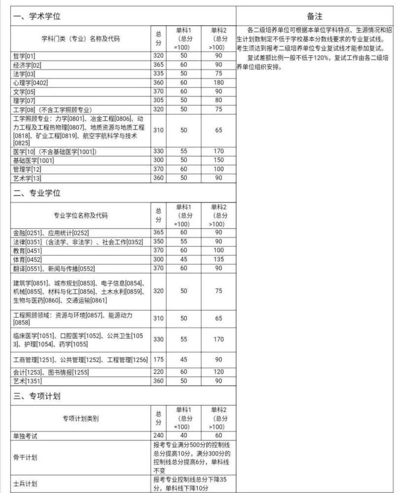 根据教育部《2020年全国硕士研究生招生考试考生进入复试的初试成绩基本要求》(以下简称国家线),结合学校招生计划情况,按照差额复试比例要求,部分专业在符合国家线的基础上进行自划线,详见下表。其他专业均为教育部A类地区复试分数基本线。