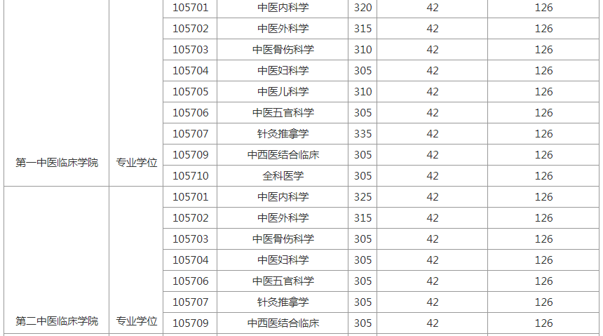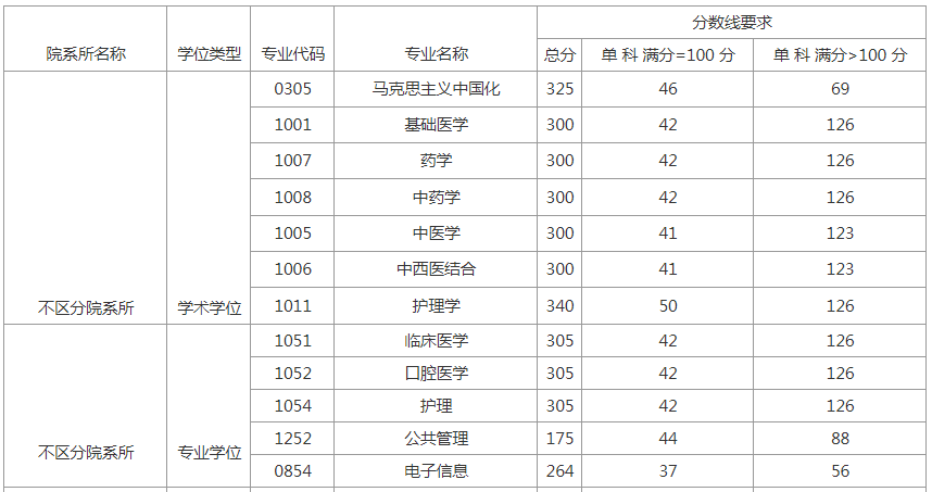 注:1、我校临床各专业专业学位(专业代码为:1051,1052,1054,1057)校内基础分数线为:总分不低于为 305分,英语不低于42分;